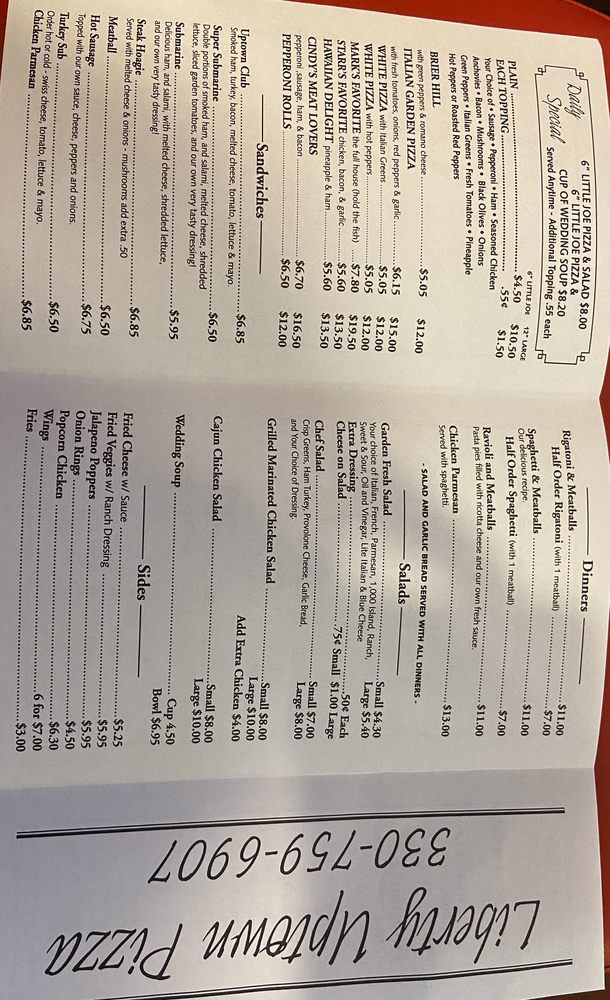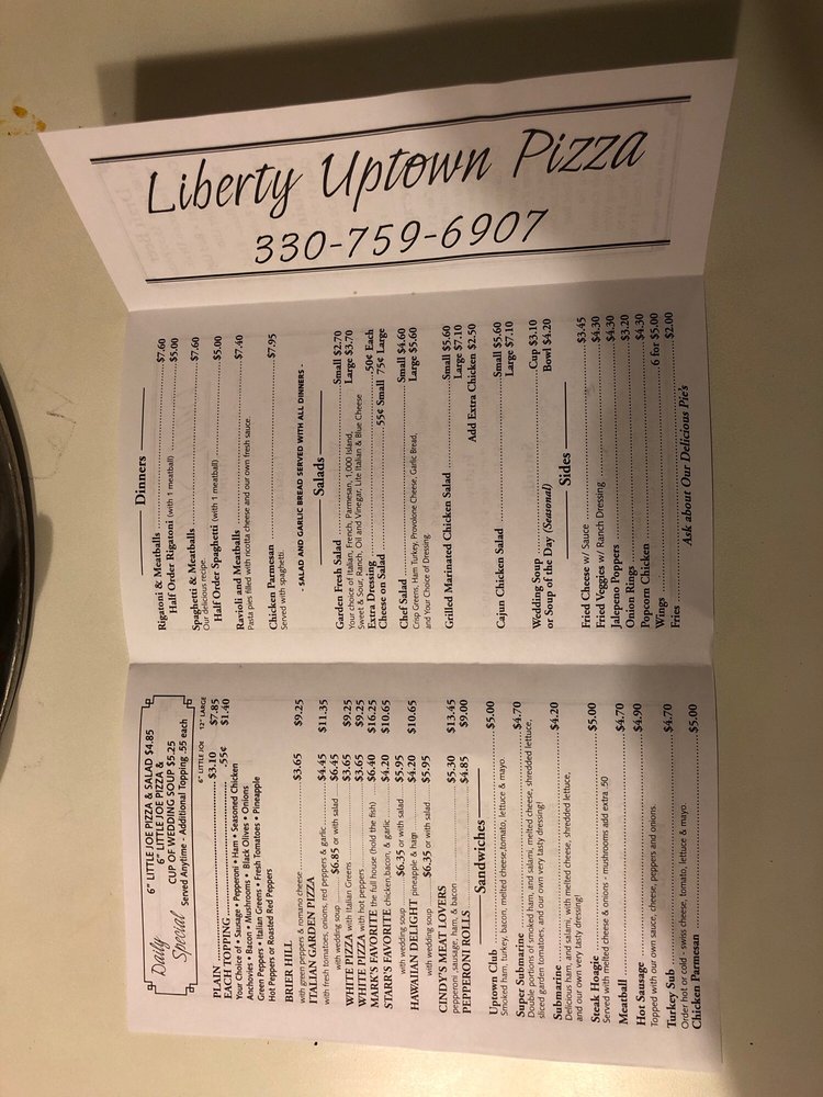 Uptown Pizza Shops on 2940 Belmont Ave in Youngstown, OH is a must-visit for pizza lovers. Offering takeout, reservations, delivery, and a variety of vegetarian options, Uptown Pizza is a casual spot with a moderate noise level suitable for groups and families. The menu boasts delicious salads, sandwiches, and of course, mouth-watering pizzas like Mark's Favorite and Cindy's Meat Lovers. Customers rave about the quality of the food, with reviews praising the outstanding spaghetti, garlic bread, and impeccable service. Whether you're a fan of traditional flavors or looking to try something new like the White Pizza with Hot Peppers, Uptown Pizza Shops promises a delightful dining experience that will keep you coming back for more.